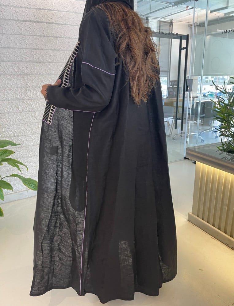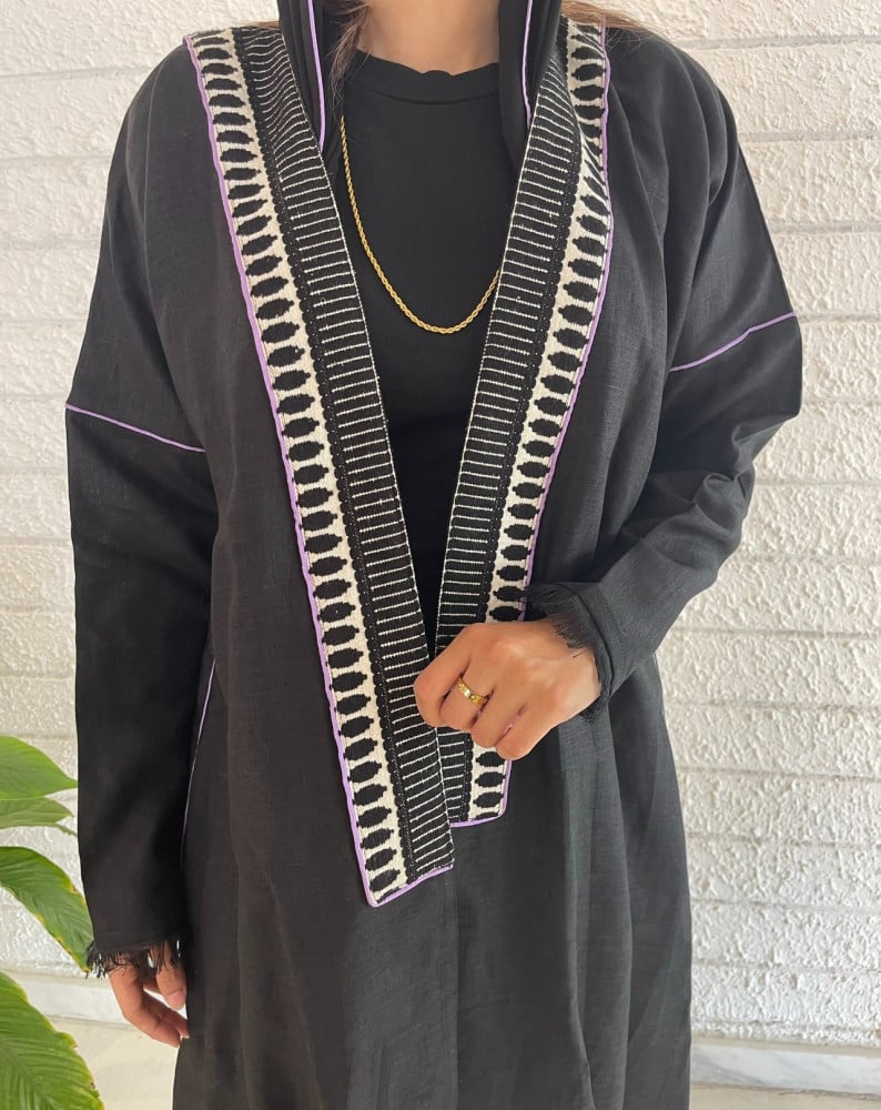 عباية لينن بتصميم مستلهم من التراث السعودي نقشة السدو و مُزينة باللون البنفسجي (اللافندر) ، القماش لينن طبيعي 100% ..